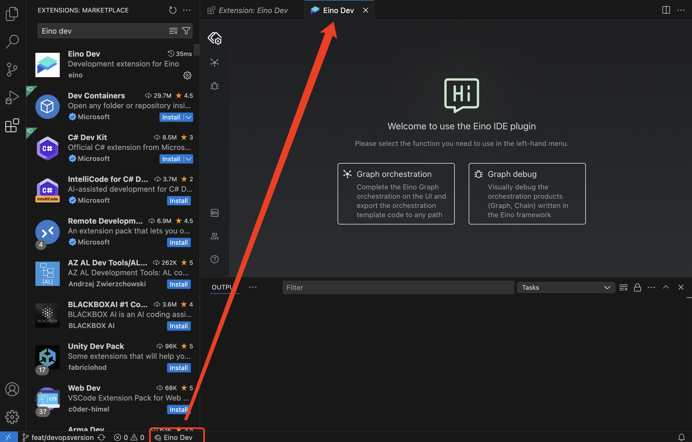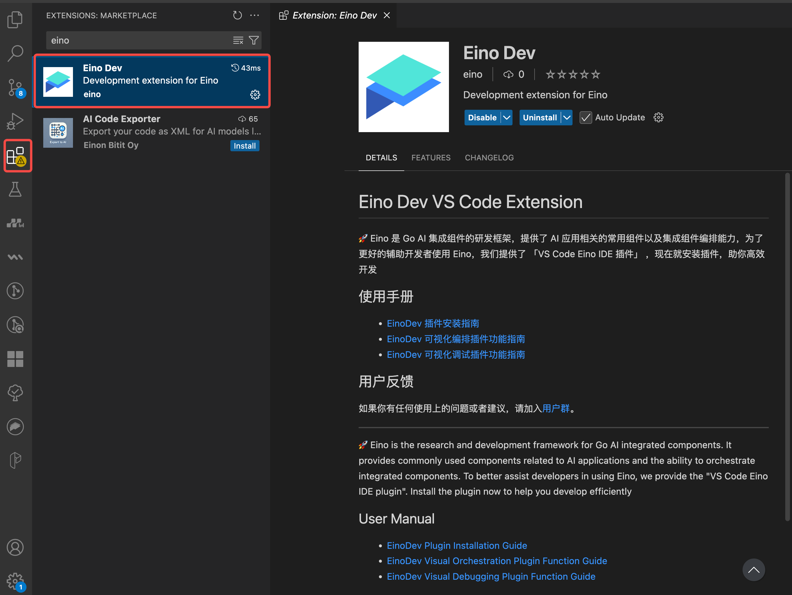 - Open Extensions, search for “Eino Dev”, and install.